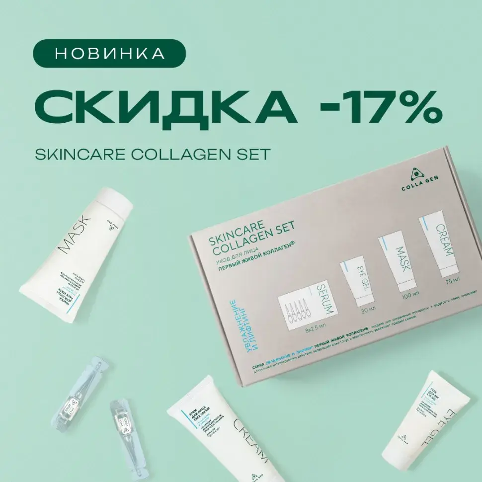 Полный уход для вашей кожи в одном наборе. Skincare Collagen Set — это готовая система домашнего ухода с ЖИВЫМ КОЛЛАГЕНОМ, которая объединяет всё необходимое для красоты и здоровья кожи: очищение, увлажнение, лифтинг и восстановление. Вместо десятков разрозненных средств вы получаете продуманный комплекс, который работает сразу в нескольких направлениях — кожа становится более упругой, гладкой и сияющей уже через несколько недель